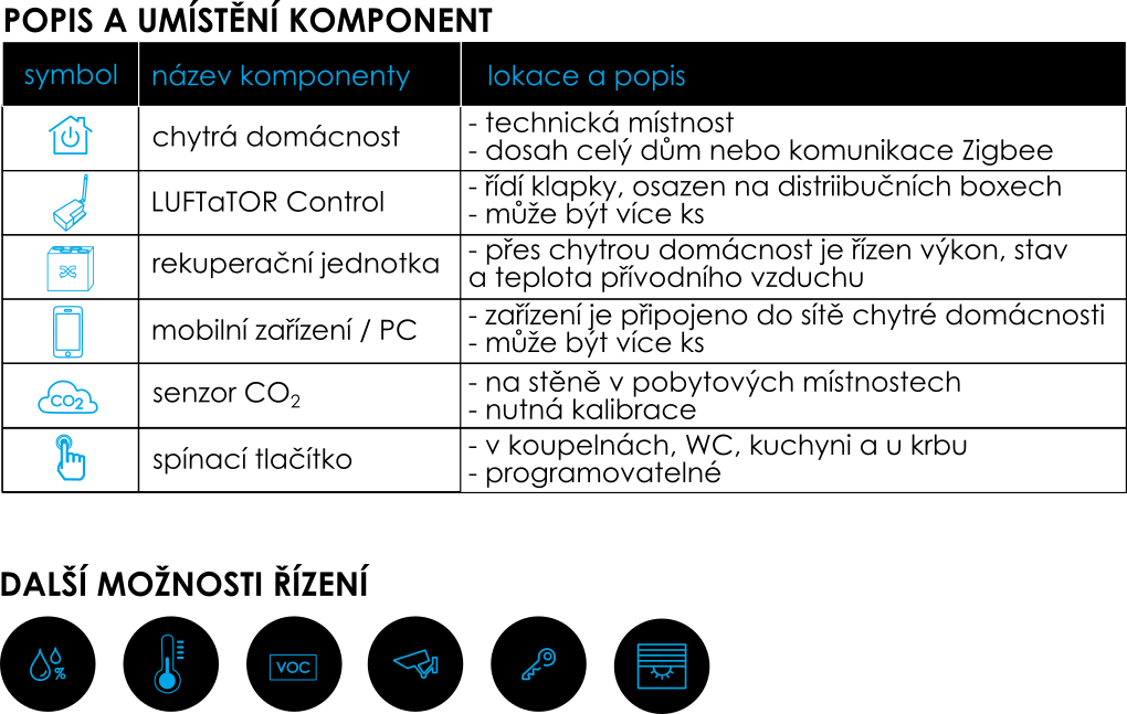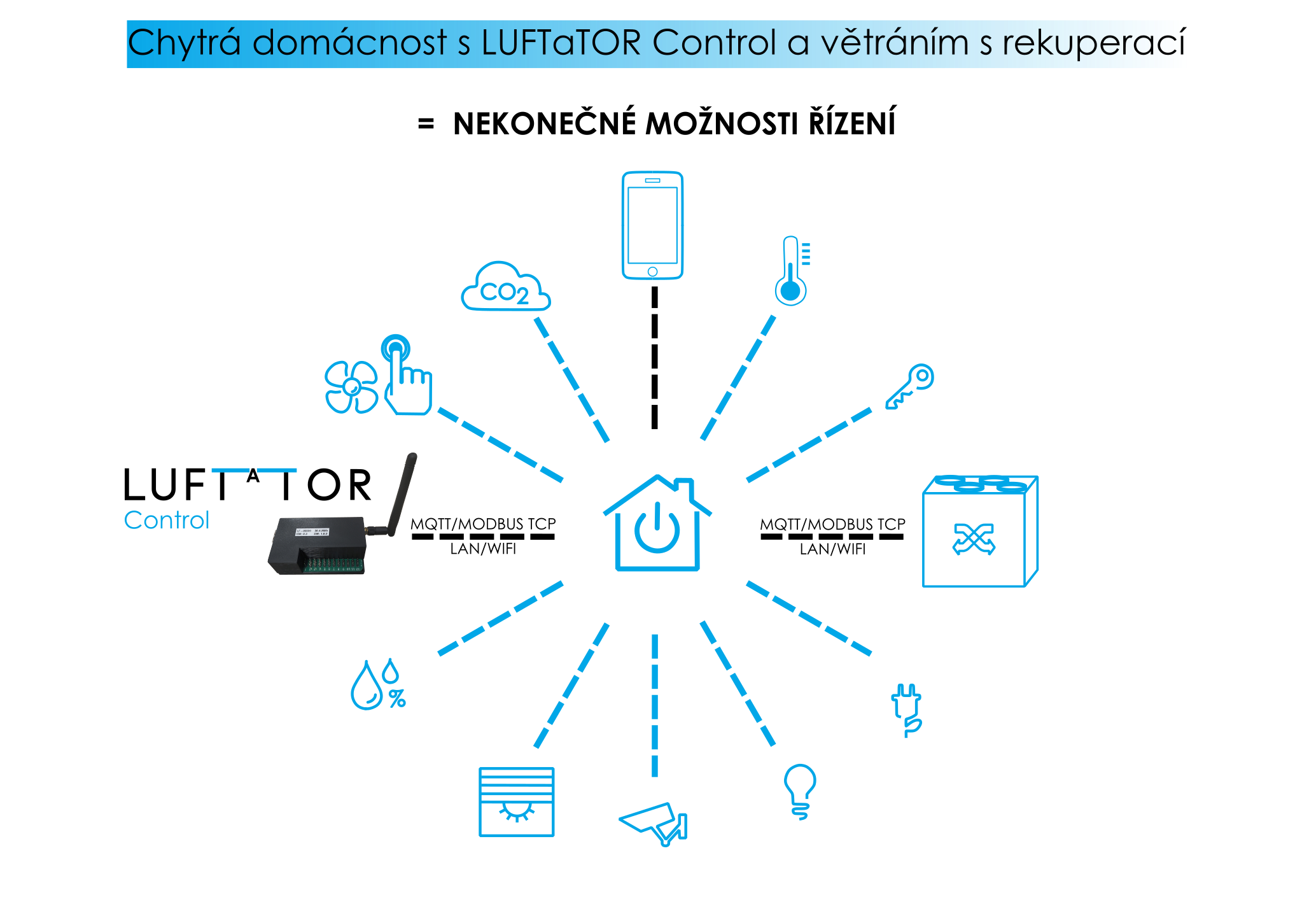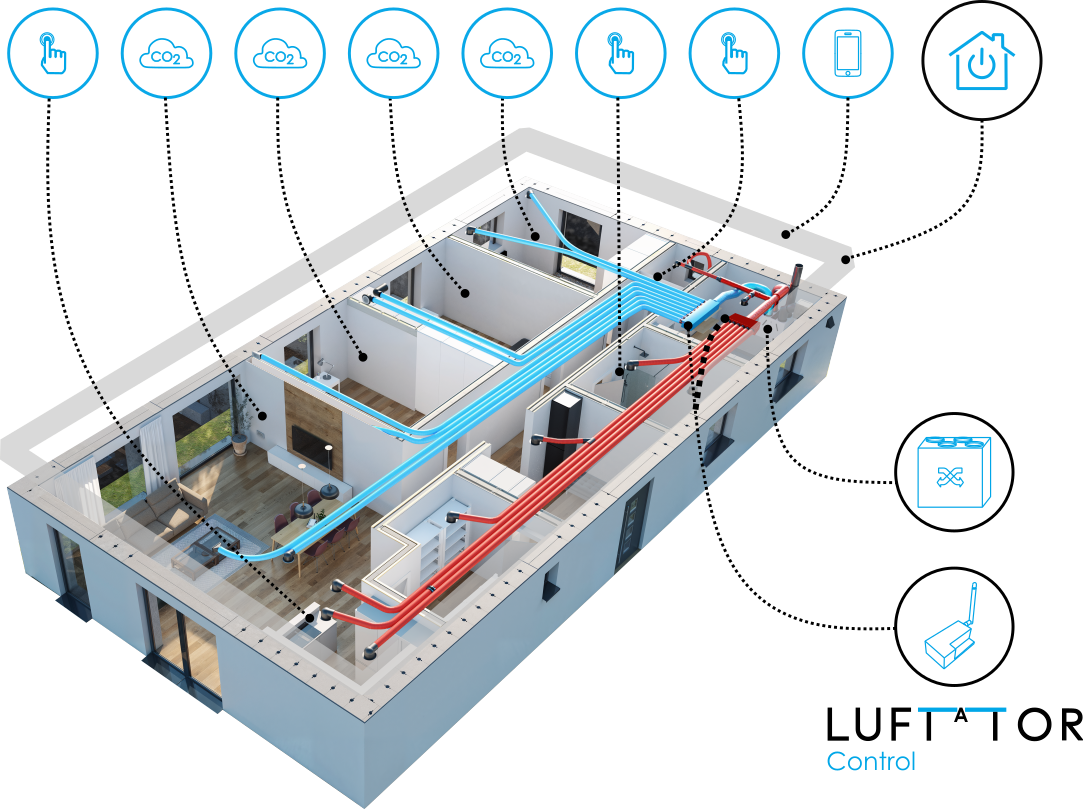 Zařízení LUFTaTOR Control komunikuje s řídicí jednotkou Smart Home, která řídí regulační klapky (LUFTooL Damper automat), které plynule regulují objemový průtok vzduchu do definovaných větracích zón. Klapky pracují na principu VAV (Variable Air Volume).