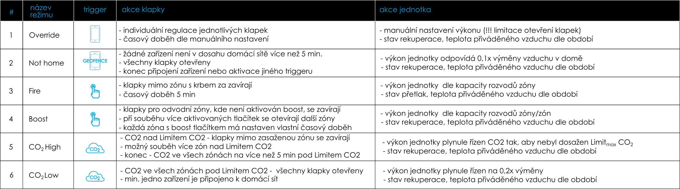 | B) Řízení pomocí scénářů a dalších zařízení | Uživatel volí předdefinované scény provozu s nastavitelnými prioritami. Dále nastaví časové rozmezí pro jejich spouštění a jejich spouštěče (triggery). Jednotka mění na základě typu scény a triggerů výkon a případně a režim. | Chytrá domácnost, časový harmonogram, geolokace (připojení mobilu v domácí síti), tlačítka/switche/buttons (pro ruční spuštění scény), eventuálně základní čidla IAQ. |