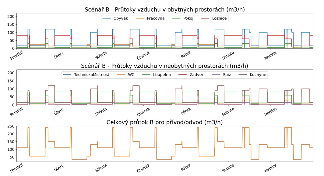 Výměna vzduchu je pro oba scénáře nastavena tak, aby větráním byla mařena stejná škodlivina ve stejné místnosti shodným průtokem vzduchu (CO2, vlhkost, apod.). Týdenní režim simuluje, kde a kdy vznikají škodliviny. V případech nejistoty, kde se osoby pohybují je i v případě Scénáře B, použita scéna nazvaná Pohyb osob, kdy větrání probíhá stejně jako u trvalé regulace ve všech místnostech budovy.