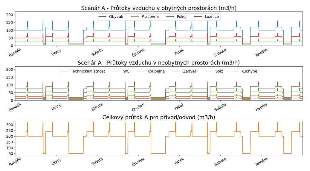 Obr. 3 Nastavení průtoku vzduchu v jednotlivých místnostech a celkově pro Scénář A