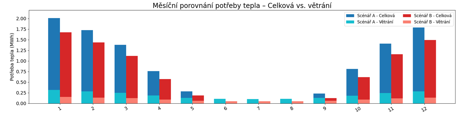 Pro Scénář A byla vyčíslena celková roční bilance: vytápění 10,5 MWh a chlazení 0,244 MWh. Pro Scénář B vyšly tyto výsledky: vytápění 8,4 MWh, chlazení 0,342 MWh. Vyšší potřeba na chlazení u Scénáře B je dána jednotným zadáním průtoků pro celý rok. Scénář A umožňuje účinnější chlazení díky vyššímu průtoku. V případě vhodnosti využítí bypassu