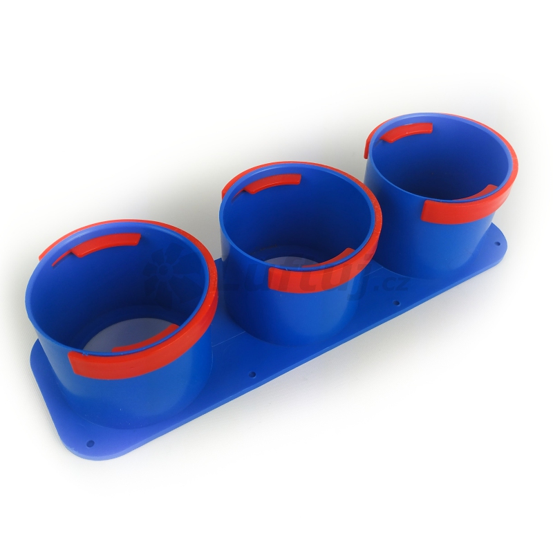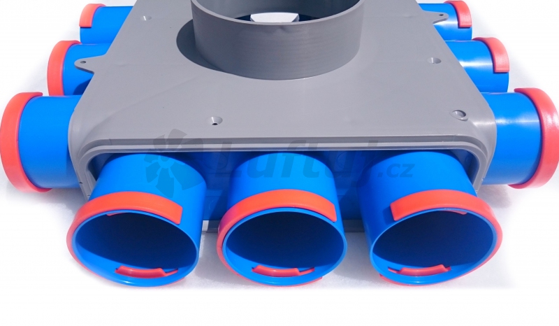 Jednoduché připevnění potrubí 75mm pomocí O-kroužku a červeného klipu. V případě menšího počtu hadic, lze některé hrdla zaslepit.