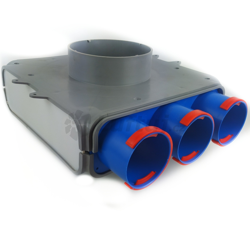 Plastový rozdělovací/distribuční box pro systémy větrání s rekuperací. Box je vhodný umístit pod strop nebo do podlahy. Servis přes centrální potrubí (160 mm). Jednoduché připevnění potrubí 75mm pomocí O-kroužku a červeného klipu.