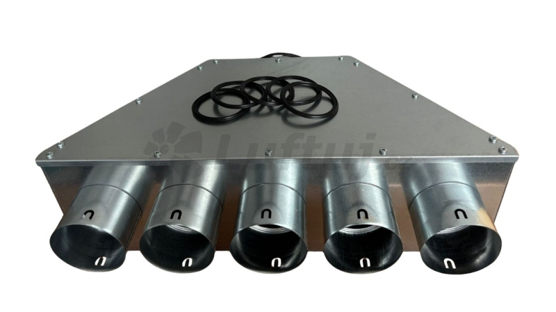 Rozdělovací box pro systém větrání s rekuperací, který vyniká svým tvarem, který napomáhá rovnoměrnému proudění vzduchu. Materiál: - box: oboustraně pozinkovaný plech tl.0,5mm 0,8mm s minimální vrstvou pozinkování 275g/m2 - vnitřní izolace boxu: na bázi syntetického kaučuku s uzavřenými buňkami - těsnící kroužky: pryž EPDM 60, barva černá, tvrdost Sh A 60°, specifická hmotnost 1,22g/cm3 Vlastnosti: - váha boxu 6,9kg - vyústek DN 160 je určen pro napojení "SPIRO" potrubí (Ø 160mm) - vyústky DN 90 pro flexibilní potrubí KLIMAFLEX SB (vnitřní Ø 94,6 +- 0,5mm) nebo nabízíme DALFLEX, jenž plně nahrazuje Klimaflex SB. - rozměrové tolerance dle ČSN ISO 2768-1 Součástí dodávky: - 1ks těsnícího kroužku DN 160 - 4ks těsnicích kroužků DN 90 - montážní úchyty - pojistky proti vysunutí flexibilního potrubí jsou součástí vyústků Použité materiály neobsahují nebezpečné látky v souladu s nařízením (ES) č.1907/2006 (REACH) a jsou v souladu se směrnicí 2011/65/EU (ROHS) o obsahu olova, kadmia, rtuti a šestimocného chromu, polybromovaných bifenylech (PBB) a polybromovaných difenyletherech (PBDE).