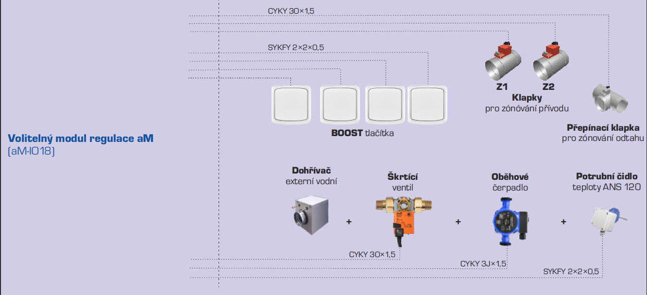 K rozšíření regulace o další kopmonenty jako jsou např. další čidla, zónovací nebo směšovací klapky, boost tlačítka nebo řízení vodního ohřevu je nutné objednat doplňkový modul regulace aMotion aM-IO18.