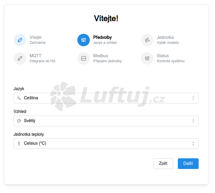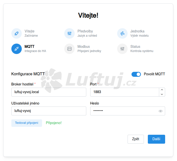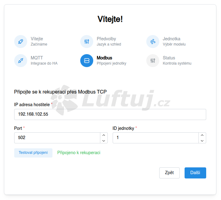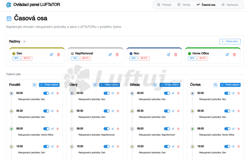 Využijte zaváděcí cenu. Pomozte nám rozběhnout projekt. LUFTaTOR Control je inovativní systém umožňující řízení průtoku přívodního i odvodního vzduchu v systémech s rekuperací tepla v rodinných domech a bytech. Díky kompatibilitě s modulárním systém LUFTooL Distribute umožňuje řízení průtoku do 100 m3/h a to jak ve flexibilním plastovém potrubí s průměrem 75 a 90 mm, tak v tradičním potrubí SPIRO 100 mm. S nadřazeným systémem řízení domu komunikuje pomocí protokolu MQTT nebo MODBUS. To umožňuje systém LUFTaTOR zapojit do běžně dostupných systémů chytrých domácností jako je Home Assistant, openHAB, Loxone, Domoticz apod. Proč zónovatSystém LUFTaTOR a samotné řízení průtoku vzduchu do jednotlivých částí domu řeší mnoho problémů spojených s větráním s rekuperací tepla v rodinných domech jako je:- přesoušení vzduchu v pobytových místnostech v zimním období, je často spojeno se zbytečně vysokou intenzitou výměny vzduchu i v prostoru, kde nevznikají škodliviny- nedostatek prostoru - pokud větráme jen tam kde je třeba, stačí pro provoz menší rekuperační jednotka, to může vyřešit problém s prostorovým omezením- hluk tvořený rekuperační jednotkou - eliminujeme tím, že jednotka je provozována na vysoké průtoky pouze výjimečně. Pro rychlé vyvětrání koupelny, stačí obvykle méně než 100 m3/h. Bez zónování pro stejnou intenzitu výměny vzduchu v koupelně větráme navíc i ostatní místnosti (kuchyně, WC,...) takže jednotka musí větrat celý dům někdy až trojnásobným průtokem- hluk u vyústek - snižujeme tím, že všechny distrubuční elementy mohou zůstat úplně otevřené- snížení nákladů na provoz - výměna filtrů, spotřeba ventilátorů, spotřeba předehřevu, tepelná ztráta způsobená větráním - vše díky zónování snižujeme na minimum- pořizovací náklady - pořízení jednotky s polovičním průtokem plně kompenzuje náklady na pořízení systému zónování, který do budoucna přináší výhody Systém LUFTaTOR Control je:• určen k řízení až 12 ks modulů LUFTooL Distribute Damper (automat) • schopen komunikovat pomocí protokolu MQTT nebo MODBUS • možné aktualizovat a servisovat- vždy zajistěte přístup k řídící desce i servopohonům • napájen 5 VDC pomocí spínacího adaptérem nebo POE ethernet (napájení není součástí dodávky) • možné připojit pomocí WLAN (WIFI) nebo LAN (ethernet) • vybaven tlačítkem pro konfiguraci a LED diodou indikující stav zařízení • určen pro použití s okolní teplotou 10 až 40° C • vhodné používat s rekuperačními jednotkami s funkcí konstantního průtoku (CF) • držitelem certifikace CE Nastavení vždy konzultujte s profesionálem v dané oblasti jako je projektant nebo proškolený technik vzduchotechniky a MaR. Proč řídit pomocí LUFTaTOR ControlLUFTaTOR Control jsme vyladili tak, aby byl pohyb klapek co nejtišší a z pohledu spotřeby, co nejméně náročný.Spotřeba při pohybu všech 12 klapek je pouze 7 W. S touto spotřebou počítejte pouze několikrát za den a vždy jen po dobu pohybu klapek což je max. 1800 ms. Spotřeba zařízení v klidovém režimu je pouze 0,3 W.Mysleli jsme i na pokles napětí při pohybu více klapek současně. Proč nabízíme otevřený sytém řízeníNaším cílem bylo vyvinout zařízení, které je finančně dostupné a umožňuje komunikaci s jakoukoliv chytrou domácností. Zároveň je připraveno zapojit se do systému řízení jakékoliv jednotky podporující běžně dostupné komunikační protokoly. LUFTaTOR Control, tak můžete nainstalovat k rekuperaci a rozvodům, které již několik let používáte. Pro osazení na potrubí lze využít LUFTooL Damper set na potrubí pro nové instalace doporučujeme využít snadné montáže modulu klapky přímo na distribuční boxy. Víme, že mezi našimi klienty je mnoho chytrých hlav. Nastavení tak necháváme plně na klientovi. Abychom Vám usnadnili rozjezd zařízení připravili jsme Open Source repozitář na https://github.com/luftuj-cz/home-automation. Tam si lze stáhnout návod pro komunikaci s jednotkami + konfigurační soubory k chytrým systémům řízení jako je Home Assistant. Věříme, že s Vaší pomocí repozitář postupně naplníme a bude se jednat dlouhodobě o živý proces. Pozn. všechny tyto soubory jsou bez záruky. Budeme rádi pokud se vždy s námi podělíte o zpětnou vazbu nebo i soubory, které případné chyby opravují. Na co si dát pozor1) průtok jednotky je nutné sladit s otevřenými klapkami. Pokud špatně nastavíte scénu, která bude požadovat průtok jednotky vyšší než je potrubí za distribučním boxem schopno pojmout, tlak na klapky bude příliš velký a může dojít k poškození systému (více viz technický list) Vždy ověřte jak ve Vaší jednotce fungují funkce, které mohou být nadřazeny požadovanému průtoku, který jednotce přikazuje chytrá domácnost. Mezi tyto funkce může patřit např: - funkce bypass (noční předchlazení) - ujistěte do jakého průtoku se tato funkce přepíná a připravte na to klapky- protimrazová ochrana- externí zařízení na potrubí jako je ohřívač. zvlhčovač apod 2) po instalaci vždy doporučujeme provést zaregulování systému v jednotlivých scénách. Při realizaci rozvodů v rodinných domech, se trasy potrubí mohou značně odlišovat od naprojektované varianty. Rozdíl v tlakových ztrátách jednotlivých větví netvoří pouze klapka, ale i potrubí a distribuční element. Proto je nutné každou vyústku přeměřit pro každou scénu (průtok jednotky a otevření klapky) 3) vyústky - pokud zónování instalujete do již zaregulovaného systému pomocí vyústek. Nezapomeňte vyústky plně otevřít tak, aby hluková zátěž byla co nejnižší a plně jste využili