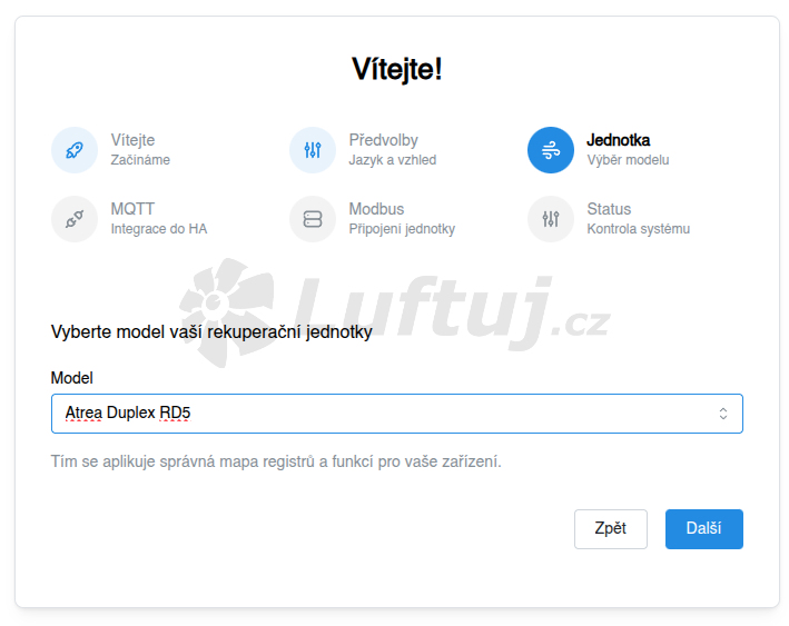 - umožňuje řízení rekuperační jednotky přes MODBUS protokol, jednoduše vyberete jednotku ze seznamu podporovaných jednotek