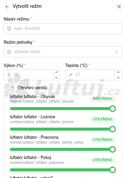 - umožňuje snadné vytvoření scén/režimů, které určují pozici klapek LUFTooL Damper Automat a stav jednotky přes MQTT