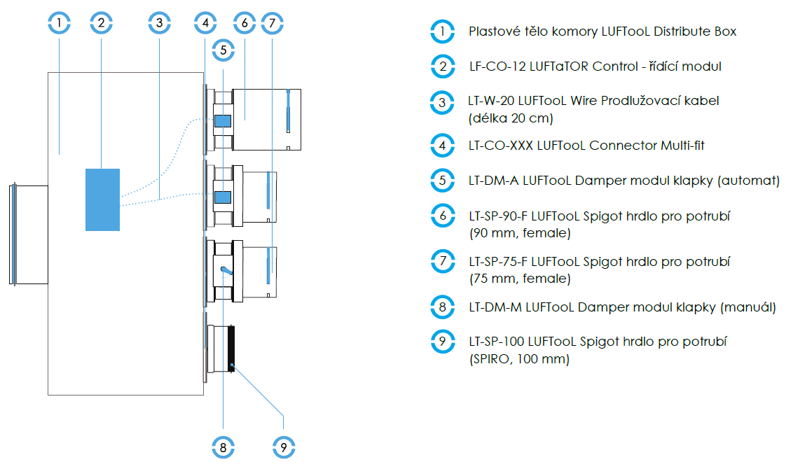 Konektor je součástí systému LUFTooL Distribute, který je inovativní a modulární. Celý systém je určen pro snadnou regulaci vzduchu, díky kterému je možné libovolně rozdělovat proud vzduchu v jednotlivých zónách nebo místnostech v rodinných domech a menších provozovnách. Jednotlivé prvky však lze využít i pro další prvky jako jsou stropní a stěnové boxy. Konektor je např možné osadit do jakéhokoliv boxu s patřičným otvorem. Systém LUFTooL Distribute je: • inovativní systém pro rozdělení proudu vzduchu do jednotlivých zón/místností • modulární (jeho komponenty lze kombinovat) • dimenzován pro flexibilní plastové potrubí s průměrem 75 a 90 mm a tradiční potrubí SPIRO 100 mm • určen pro větrání v rodinných domech a malých provozovnách s průtoky vzduchu jednotlivými větvemi do 100 m3/h • velmi těsný systém dosahuje těsnosti třídy D dle ČSN EN 15727 • vhodný pro přívod i odvod běžně znečištěného vzduchu (bez chemických látek apod.) • plně čistitelný, protažení kartáčů přes klapku lze provést bez demontáže modulu klapky • vyrobeno z materiálu ABS a PETG Balení obsahuje: Konektor (PETG), dva těsnící kroužky. Baleno do plastového sáčku. Montáž: Na závit konektoru lze přišroubovat např. na: LUFTooL modul klapky s automatickým nebo manualním ovládáním LUFTooL hrdla pro potrubí (75, 90 a 100 mm) Příklady instalace Osazení přes konektor nebo modul klapky k distribučnímu boxu