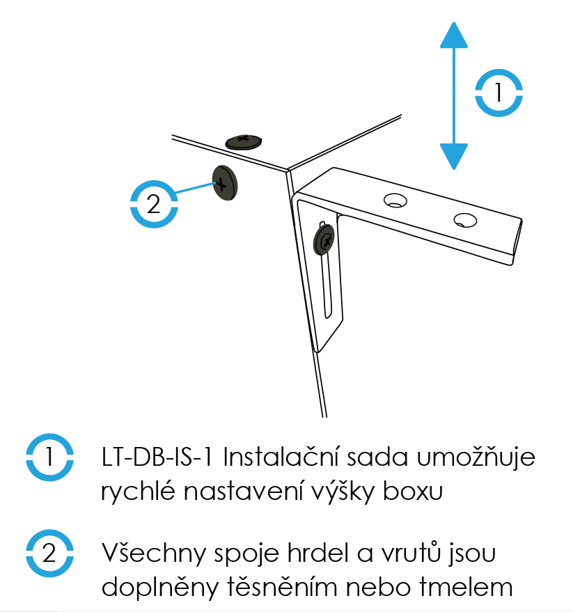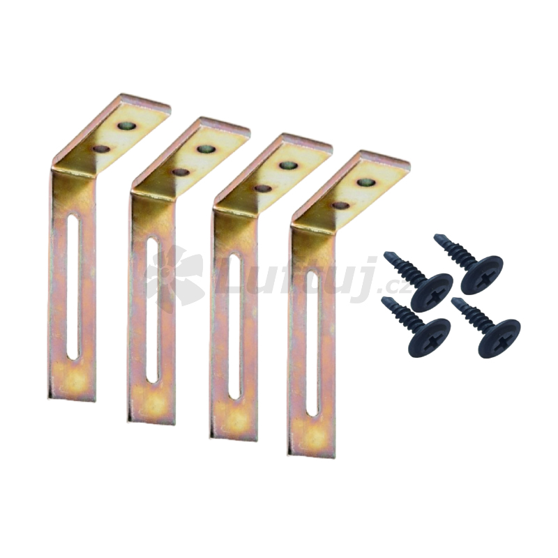Sada obsahuje čtyři kusy speciálních kovových úhelníků, které umožňují plynulou vertikální regulaci pozice boxu. Po upevnění stačí povolit a následně utáhnout vrut v podélném otvoru a tím precizně doladit výškovou úroveň boxu dle potřeby.