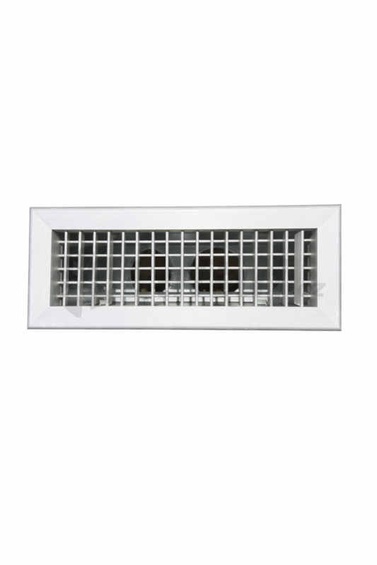 Stěnový pozinkový box 2x90 mm s eloxovanou hliníkovou mřížkou GAC 300x100 mm se směrovatelnými lamely a rámečkem pro usazení.