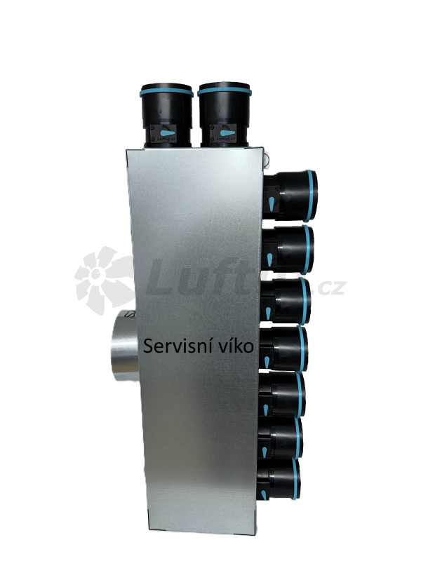 Plastový rozdělovací/distribuční box pro systémy větrání s rekuperací. Box je vhodný umístit pod strop nebo do podlahy. Servis přes centrální potrubí (160 mm). Jednoduché připevnění potrubí 90 mm pomocí O-kroužku a červeného klipu. V případě menšího počtu hadic, lze některé hrdla zaslepit.